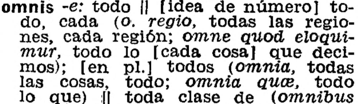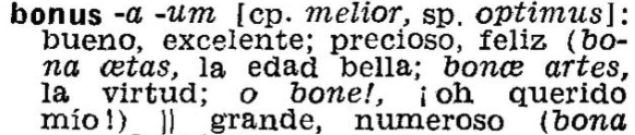 Los adjetivos aparecen siempre con su enunciado que puede tener tres terminaciones (bonus, -a, -um), dos terminaciones (omnis, -e) o una terminación, pero ojo, con el mismo enunciado que un sustantivo: nom.sg. + gen.sg. (audax, audacis). Evidentemente el género para los adjetivos no aparece porque cada forma del enunciado designa un género: -us (m.), -a (f.), -um (n.). En los de dos term. el masc. y el fem. los designa la primera forma (-is) y el neutro la segunda (-e) En aquellos que tengan formas del comparativo y del superlativo irregulares también vendrán esas formas incluidas en la entrada correspondiente. Finalmente, se ofrecen las posibles traducciones. Adjunto foto de los tres adjetivos mencionados: