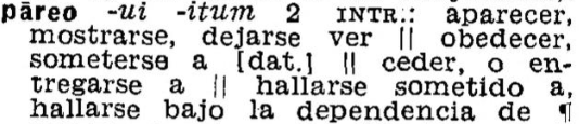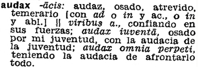 Los verbos son las palabras más problemáticas, principalmente por no saber sacar el tema correctamente. El enunciado de un verbo se compone de cinco formas, pero en el diccionario aparecen tres o, en ocasiones (con verbos de la 1ª conjugación), ¡solo una! La que siempre aparece es la 1ª sg. del presente de indicativo activo, es decir: cano, amo, rego, lego, audio… En aquellos verbos que no son de la 1ª conj. aparecerá también la cuarta forma, que se corresponde con la 1ª sg. del perfecto de indicativo activo: cecini, rexi, legi…, y la quinta forma, que es el supino (acabado en -um) y se utiliza, principalmente, para los participios. Teniendo esto claro, vemos que justo después del enunciado del verbo aparece un número del 1 al 4, que indica la conjugación del verbo (si conoces la 5ª conj. o la 3ª mixta, que son la misma, están incluidas dentro de la 3ª en el diccionario). Justo después viene la llamada naturaleza del verbo, es decir, si un verbo es transitivo (tr.) o intransitivo (intr.). ¿Y esto qué es? Básicamente si un verbo puede o no puede llevar Complemento Directo. Y créeme, es probablemente de lo más importante que puedes ver en el diccionario. Incluso más que los significados que vienen a continuación. Te dejo también el ejemplo de un verbo: